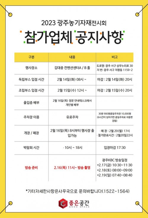 2023광주농기자재전시회 참가업체 공지사항 페이지 정보 작성자 국제농기자재전시회관리자 댓글 0건 조회 1,085회 작성일 23-02-10 16:31 본문 안녕하세요! 좋은공간입니다 ^^입점업체 공지사항을 올려드리오니참고하시기 바랍니다.부스배치도도 같이 올려드립니다 ^^감사합니다. 목록