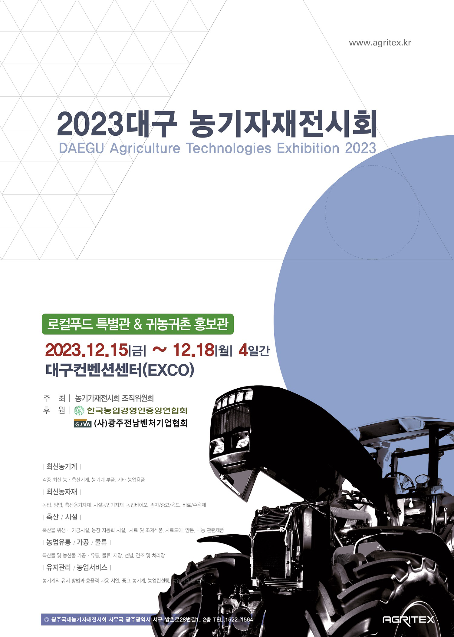 · 약칭 : AGRITEX2023개최기간 · 2023년 12월 15일(금) ~ 12월 18일(월) 5일간 장 소 · 대구광역시 대구컨벤션센터(EXCO) 주 최 · 2023 농기자재전시회 조직위원회 주 관 · ㈜마이스좋은공간, (주)아콘 후 원 · 한국농업경영인중앙연합회, (사)광주전남벤처기업협회, TBC대구방송(예정) 참 가 · 국내·외 농기자재 생산업체 및 농업 관련 기업과 단체 규 모 · 약 150여 업체 300여 부스